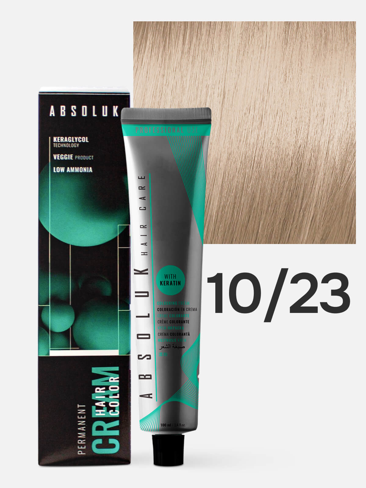 Профессиональная кремовая краска ABSOLUK Permanent Hair Color Cream 10.23 с содержанием аммиака менее 3% и восстанавливающим комплексом керагликоль (кератин и пропиленгликоль), протеинами и маслами ухаживает за волосами в процессе окрашивания, оставляя их эластичными, упругими и гладкими. Благодаря американским пигментам с повышенной стабильностью, краситель позволяет получить глубокие, насыщенные и блестящие оттенки волос со 100% прокрашиванием седины и стойкостью до 6-8 недель. Содержит рисовые аминокислоты, кератин, соевые и пшеничные протеины, масло баобаба.