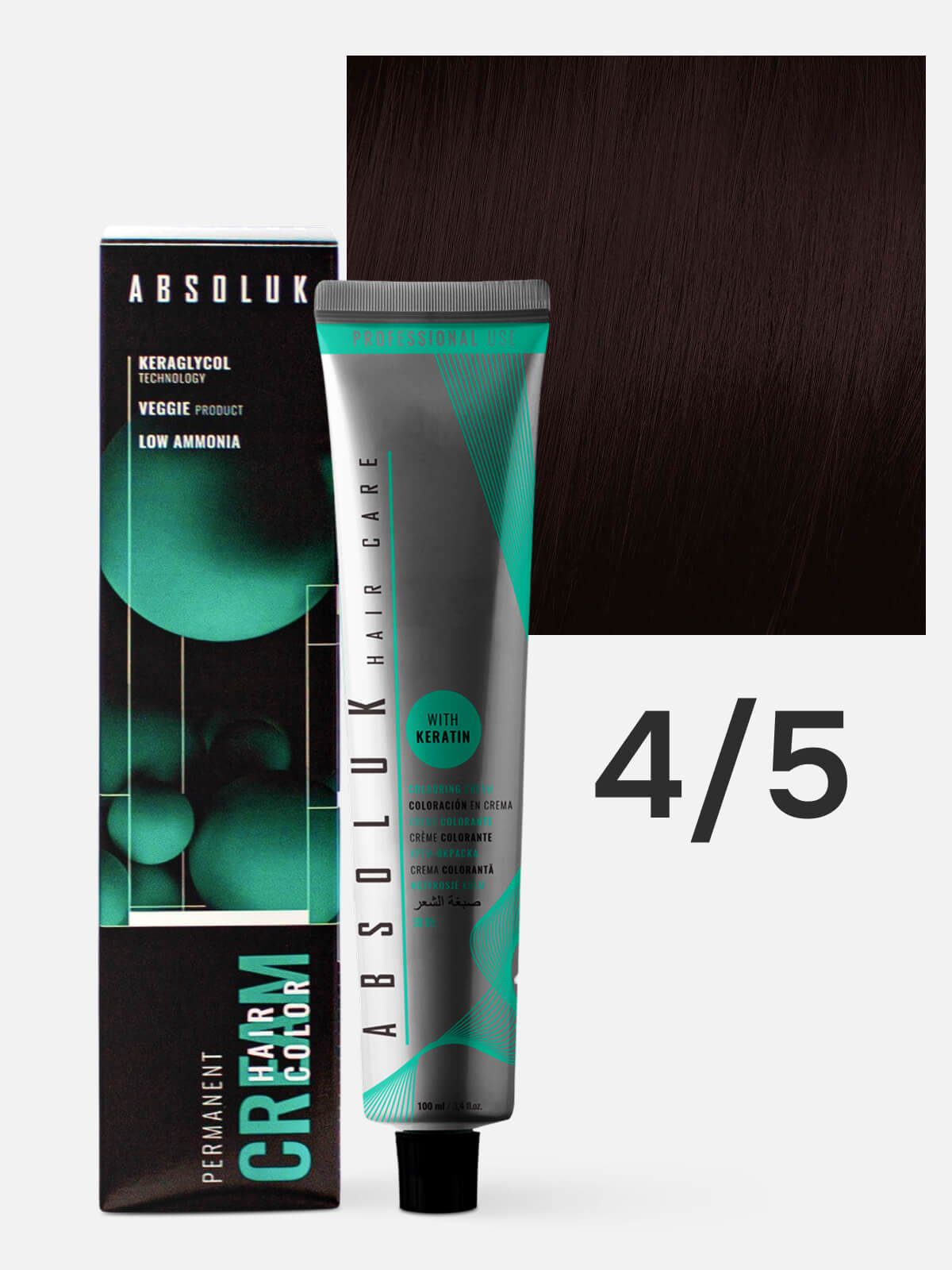 Профессиональная кремовая краска ABSOLUK Permanent Hair Color Cream 4.5 с содержанием аммиака менее 3% и восстанавливающим комплексом керагликоль (кератин и пропиленгликоль), протеинами и маслами ухаживает за волосами в процессе окрашивания, оставляя их эластичными, упругими и гладкими. Благодаря американским пигментам с повышенной стабильностью, краситель позволяет получить глубокие, насыщенные и блестящие оттенки волос со 100% прокрашиванием седины и стойкостью до 6-8 недель. Содержит рисовые аминокислоты, кератин, соевые и пшеничные протеины, масло баобаба.