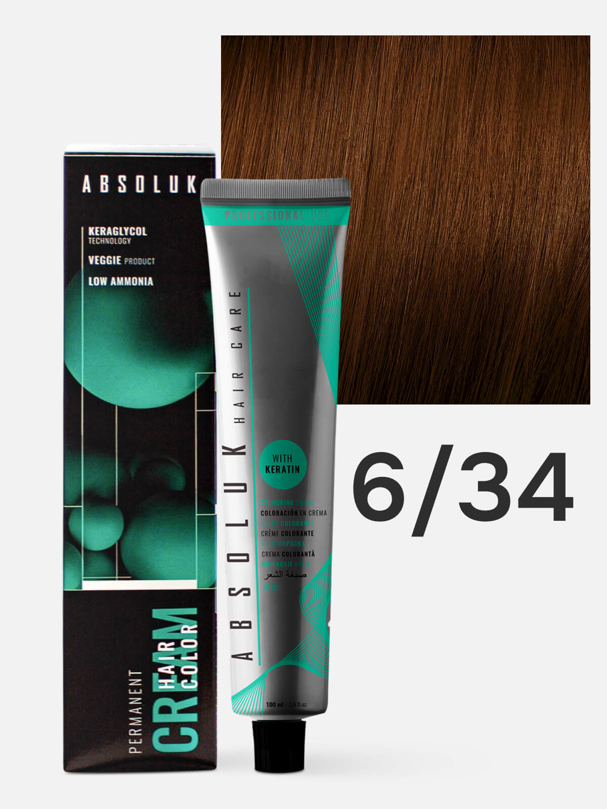Профессиональная кремовая краска ABSOLUK Permanent Hair Color Cream 6.34 с содержанием аммиака менее 3% и восстанавливающим комплексом керагликоль (кератин и пропиленгликоль), протеинами и маслами ухаживает за волосами в процессе окрашивания, оставляя их эластичными, упругими и гладкими. Благодаря американским пигментам с повышенной стабильностью, краситель позволяет получить глубокие, насыщенные и блестящие оттенки волос со 100% прокрашиванием седины и стойкостью до 6-8 недель. Содержит рисовые аминокислоты, кератин, соевые и пшеничные протеины, масло баобаба.