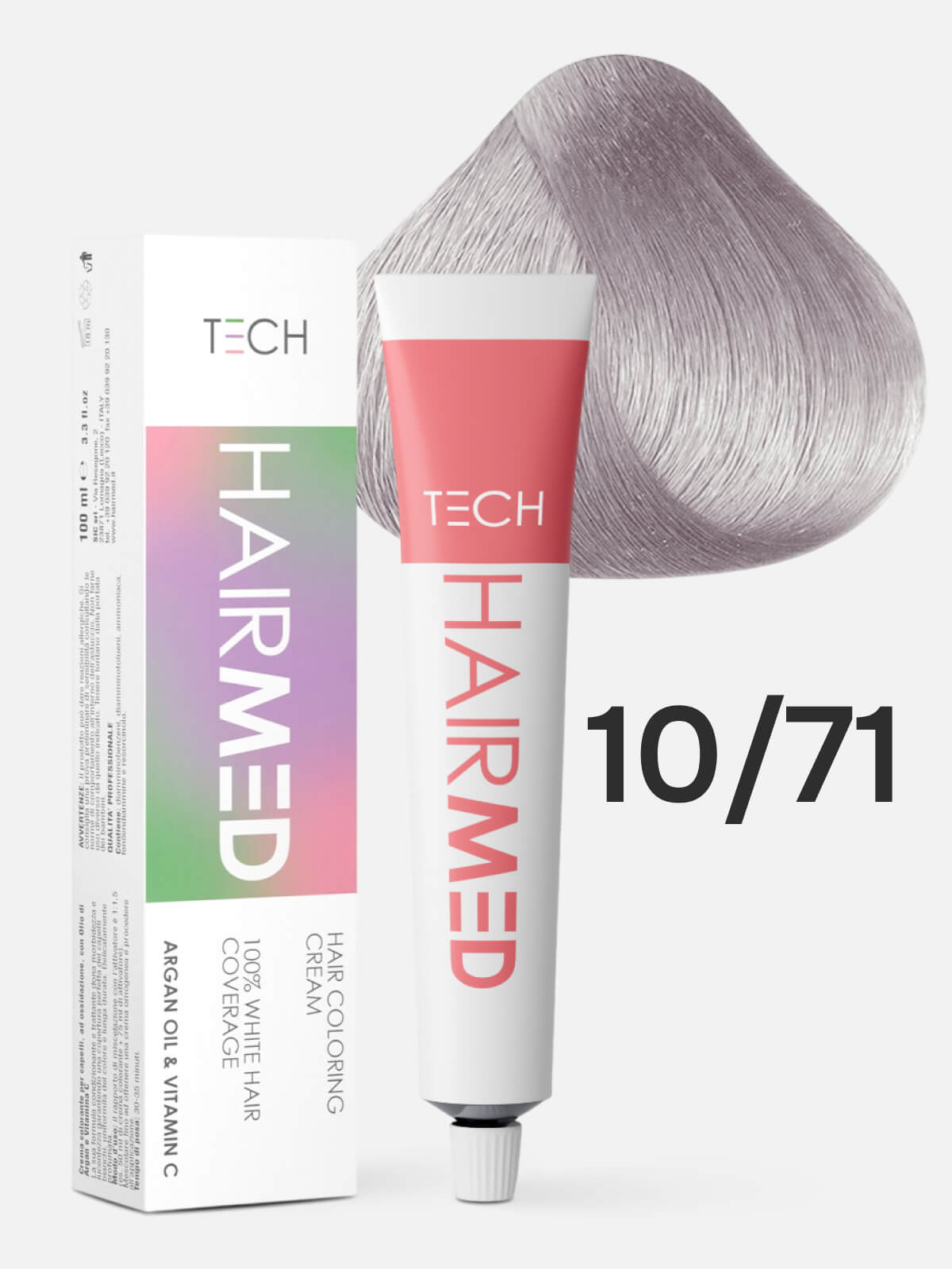 Перманентная крем-краска для волос HAIRMED Tech Hair Coloring Cream 10.71 с аргановым маслом, экстрактом цветков ромашки, глицерином и витамином С. Палитра включает в себя насыщенные, блестящие и переливающиеся оттенки, которые обеспечивают 100% покрытие седины и стойкость до 6-8 недель. Аргановое масло интенсивно питает волосы, защищает их от повреждения в процессе окрашивания, а также предотвращает выцветание пигментов от УФ-лучей. Экстракт ромашки укрепляет кутикулу волоса и защищает кожу головы от раздражения, зуда и шелушения. Глицерин и витамин С увлажняют структуру волос, нейтрализуют окислительные процессы и оказывают Anti-age эффект.
